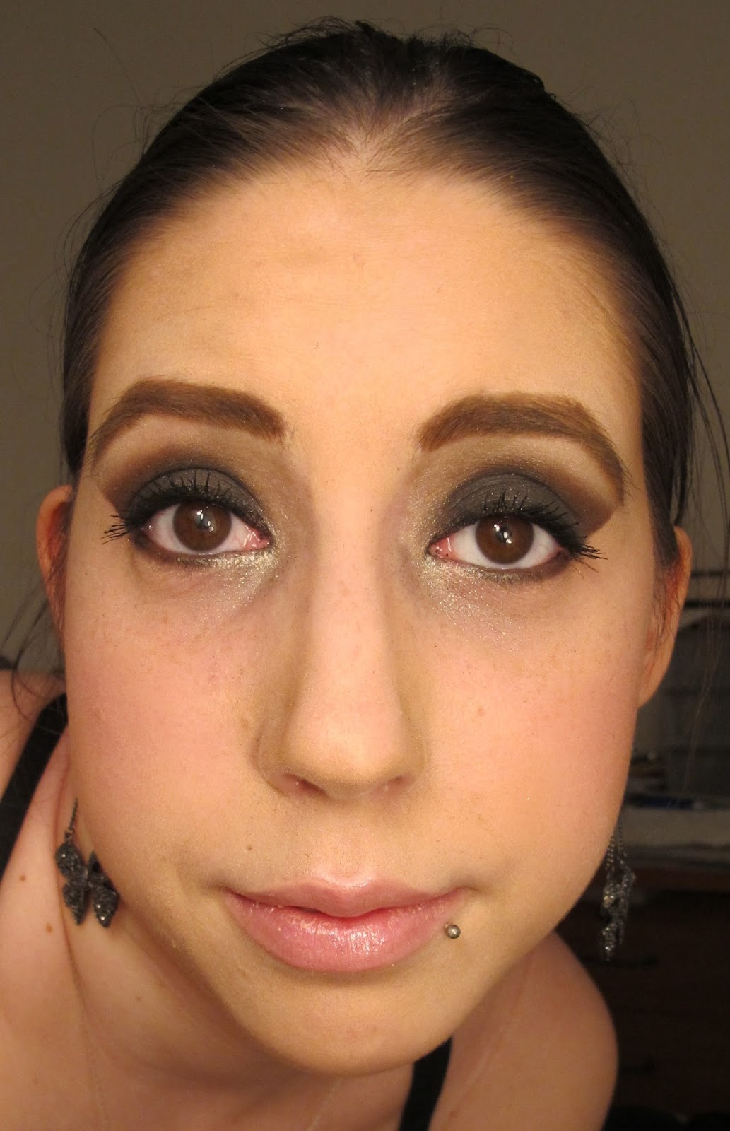 Always start by priming your eyes. I used Too Faced's Shadow Insurance. I find that you need a stickier base, so you can use a MAC Paint Pot or whatever else you have. If you want it to be dark, use MAC Paint Pot in Blackground. I'm going to refer to the shades in the MAC Veluxe Pearl Fusion Eyeshadow in Greenluxe as numbers (ex. 1,2,etc) to make it easier, since they don't have names. Using a medium eyeshadow brush (Sephora PRO Medium Eyeshadow Brush), take #4 and press it onto the lid except for the outer corner and go up to the crease. Next take a fluffy blending brush (MAC 217) and take #5 and apply it to your crease and bring it down into your outer lid. Using a clean blending brush take #3 and blend out #5 and also apply it as a highlight, basically everywhere where there isn't color already. Then taking a small shadow brush (Sephora Collection All Over Shadow Brush), take #1 and put it under your brow bone to really highlight it. Taking a small smudge brush (Stila 28) and #2 and apply it to the inner corners of your eyes. Also apply it to the inner part of your lower lid as well. I like to do the rest of my face and come back to the bottom lid later. So for the bottom lid just take #5 on an angled brush (Sephora PRO Angled Liner Brush) and apply it on your lower lid, leaving the inner corners empty of course. Now take a black eyeliner pencil like Too Faced's Perfect Eyes in Perfect Black and do the waterlines of both your top and bottom lids. Next take MAC Fluidline in Blitz and Glitz using a thin eyeliner brush (Stila 28) and apply it to the lid. You want to put a thin line, just enough to define your lid. Take a volumizing mascara like MAC Zoom Fast Black Lash in Black and apply it to your top lashes. Now you just have to fill in your brows. I use Benefit Brow Zings in Light. Now your eyes are done, let's move on to the face!
